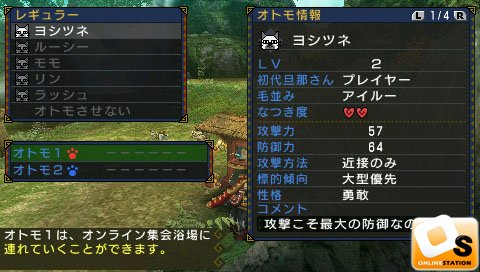เรา สามารถพาน้องเหมียวไปตะลุยเควสต์ได้มากที่สุด 2 ตัว จากภาคที่แล้วที่เราจะพกน้องเหมียวออกไปได้แค่ตัวเดียวเท่านั้น  และในโหมด online ถ้ามีผู้เล่นสองคน  ผู้เล่นทั้งสองก็สามารถพกน้องเหมียวไปได้คนละตัวด้วย เจ๋งจริงๆ  งานนี้น้องเหมียวจะได้ลุยในโลก online กันแล้ว